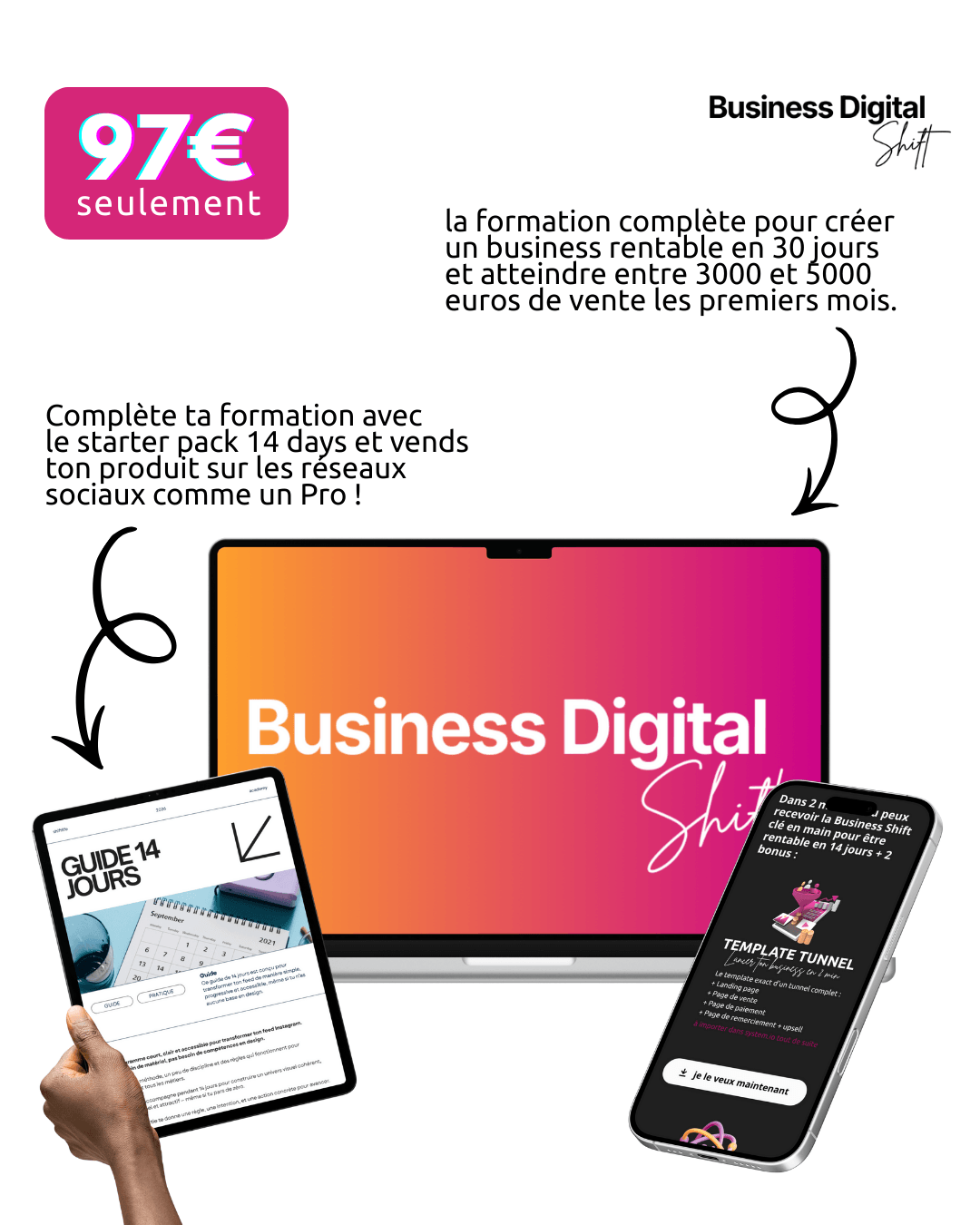 Dans 2 minutes tu peux recevoir la Business Shift digital clé en main pour être rentable en 14 jours + 2 bonus pour seulement 97€ au lieu de 297€ :